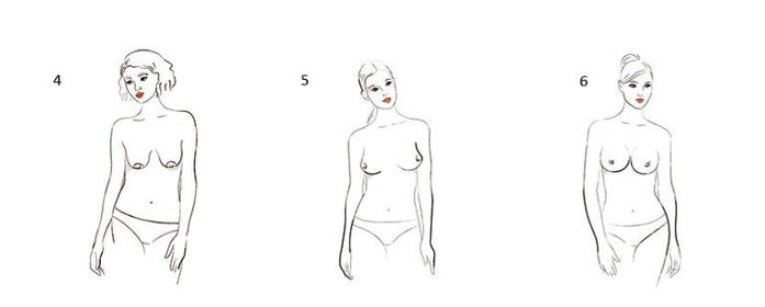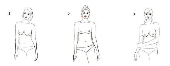 De eerste schets is er een van een vrouw metasymmetrische borsten (1). Bijna iedere vrouw - Jennifer Lawrence praatte er al over - heeft een borst die groter is dan de andere. Je kiest het best voor een beha met verwijderbare vulling. Dan kan je die alvast uit de cup van je grootse borst halen. De middenste dame heeft eerder een atletische lichaamsbouw (2) en dito boezem. Dat betekent dat je borsten iets breder en gespierder zijn. Een klassieke push-upbeha is een goede keuze, net als ondergoed die de illusie van rondingen wekt. Dame drie heeft borsten die bovenaan smaller (3)zijn, maar voller worden. Een beha die veel steun biedt is hier geen overbodige luxe.
